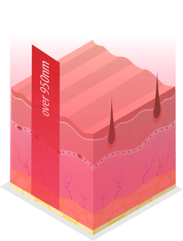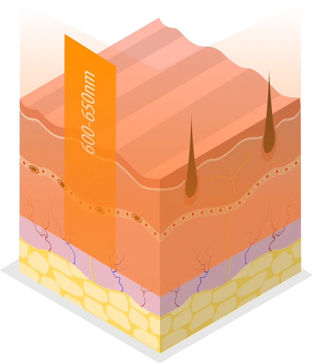 Будучи наиболее длинным спектром, оказывает воздействие на фибробласты. Восстанавливает обменные процессы и предотвращает преждевременное старение кожи.