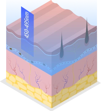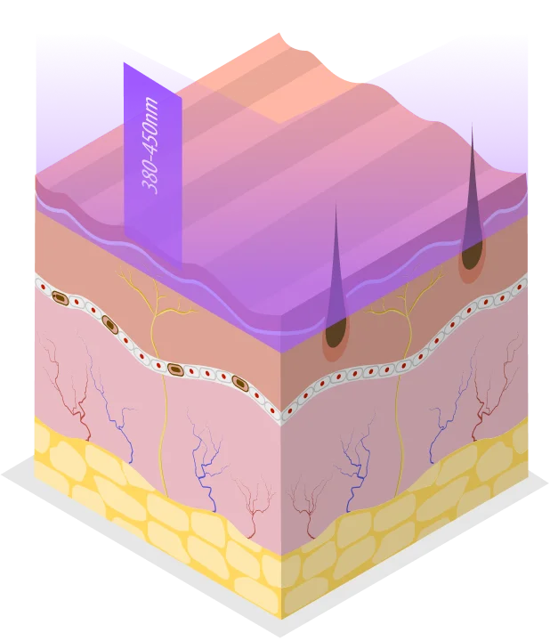 Является самым коротким спектром. Воздействуя на поверхностные слои кожи, способен уничтожать бактерии и инфекции. Активно используется в терапии акне, розацеа и псориаза.