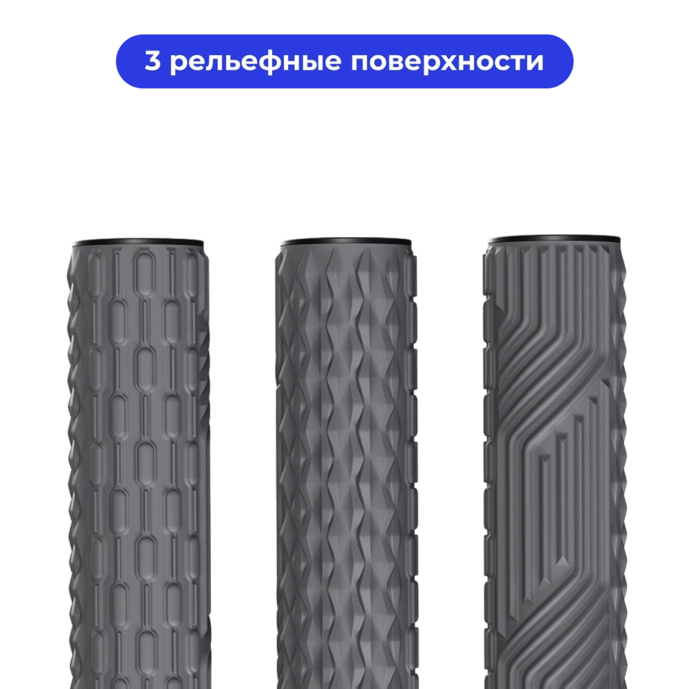 Высококачественный материал повышенной твёрдости, обладающий отличной упругостью, более эффективно передаёт кинетическую энергию к мышцам тела, что сказывается на качестве проработки фасций и растяжки мышц. Специально для проработки крупных и мелких мышечных групп поверхность валика разделена на три участка с различным рельефом.